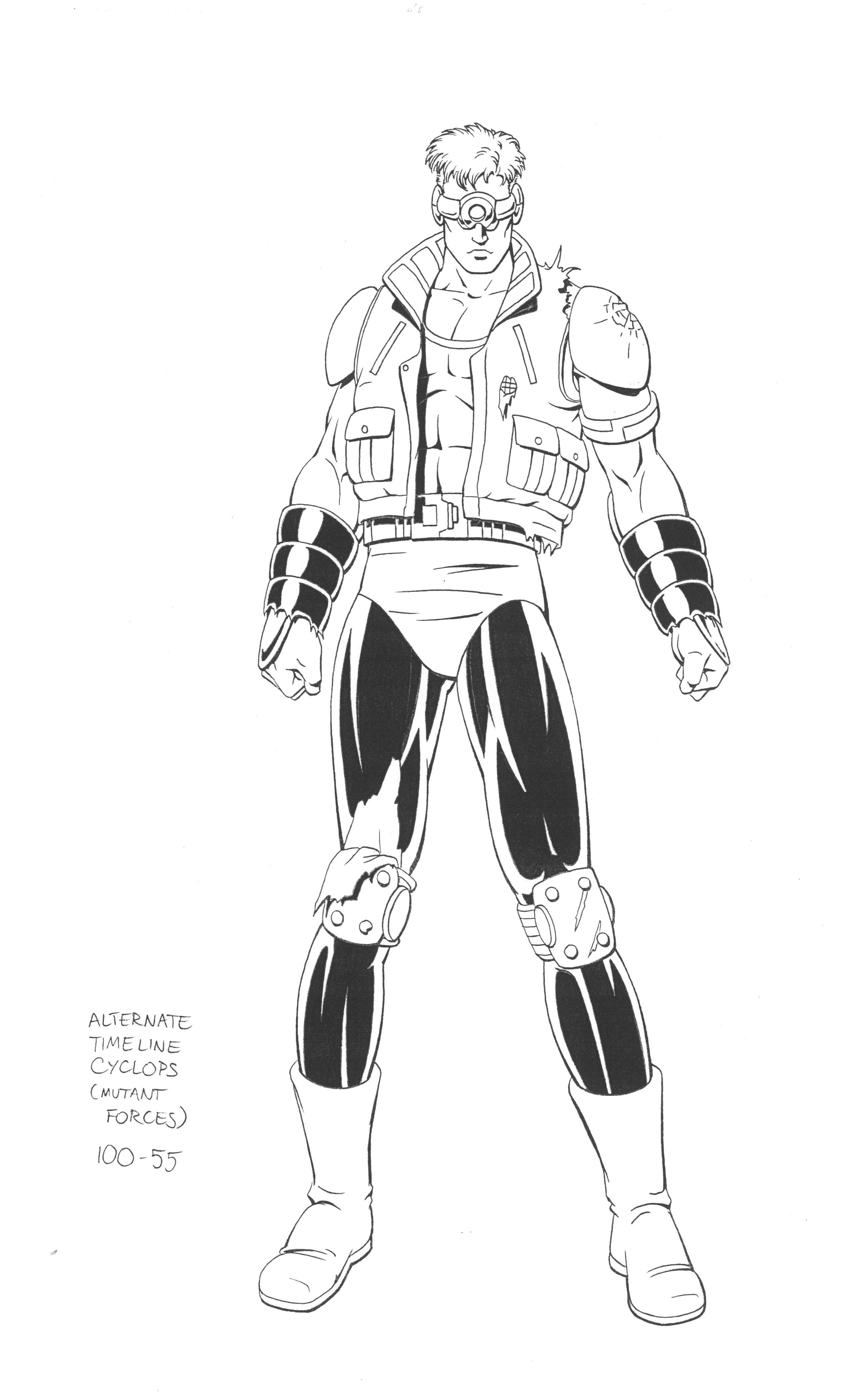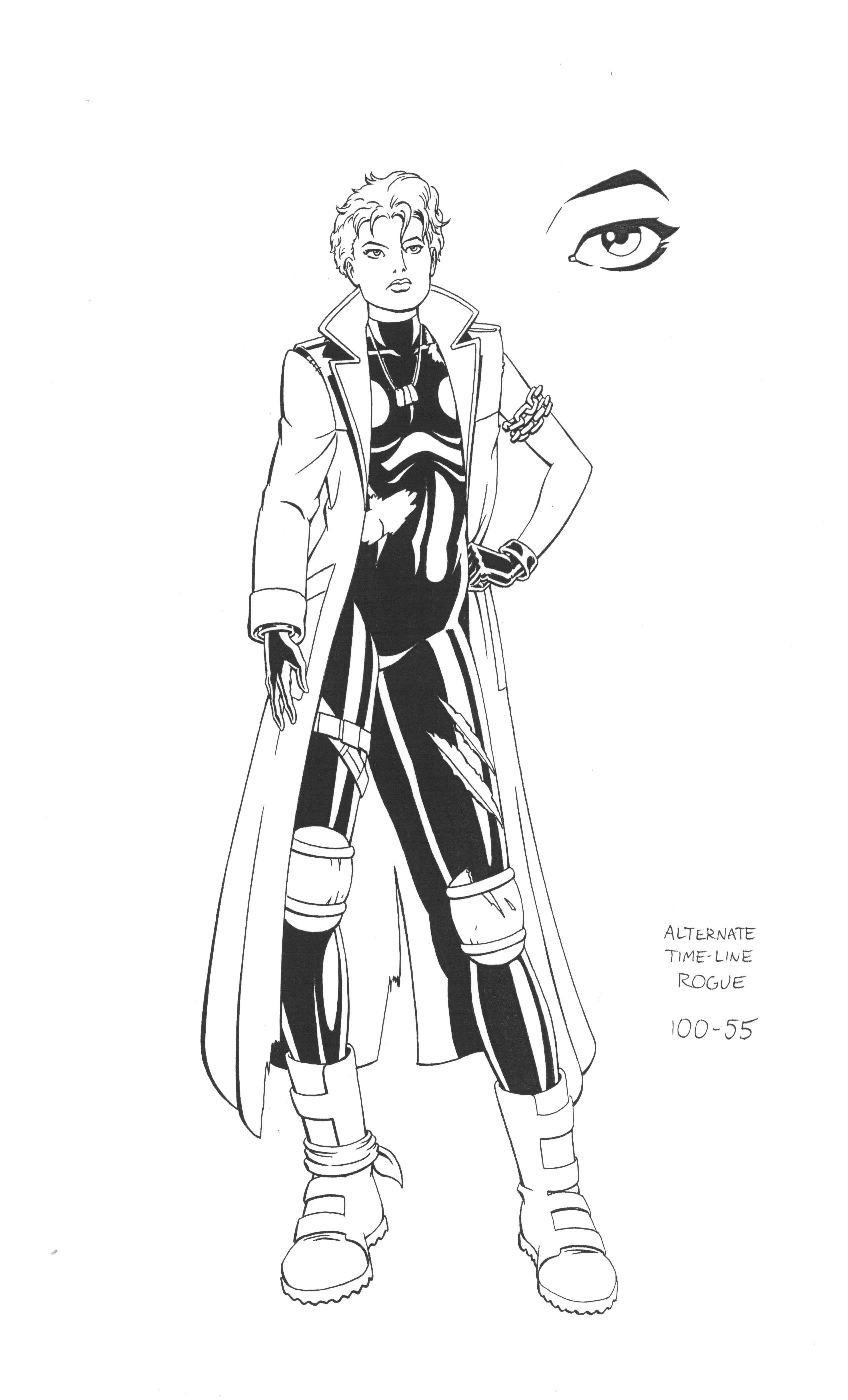 Think about it. You work on a series for five years — even one as fun as X-MEN:TAS — and drawing the same look for the same characters could get old. So imagine the fun when word comes down from the writers that we’re doing time-travel or an “alternate timeline” episode, either of which requiring new looks for the characters. Below are a couple of alternative designs for Rogue and Scott. Below those are a couple of images from one of my favorite epsisodes, “One Man’s Worth.” The first, a modern-day, idyllic moment bewteen Storm and Wolverine (having a picnic!) suddenly switches to an alternative timeline (created by evil time-travellers) where they are fighting for their lives in dystopic, miserable world. Alt-Storm is designed so much tougher, so punk, that you know her life is diferent just by looking at her. After months of drawing “normal” Storm, it must have been fun to be asked to re-imagine her. The distinctive looks sure worked for us in the story.